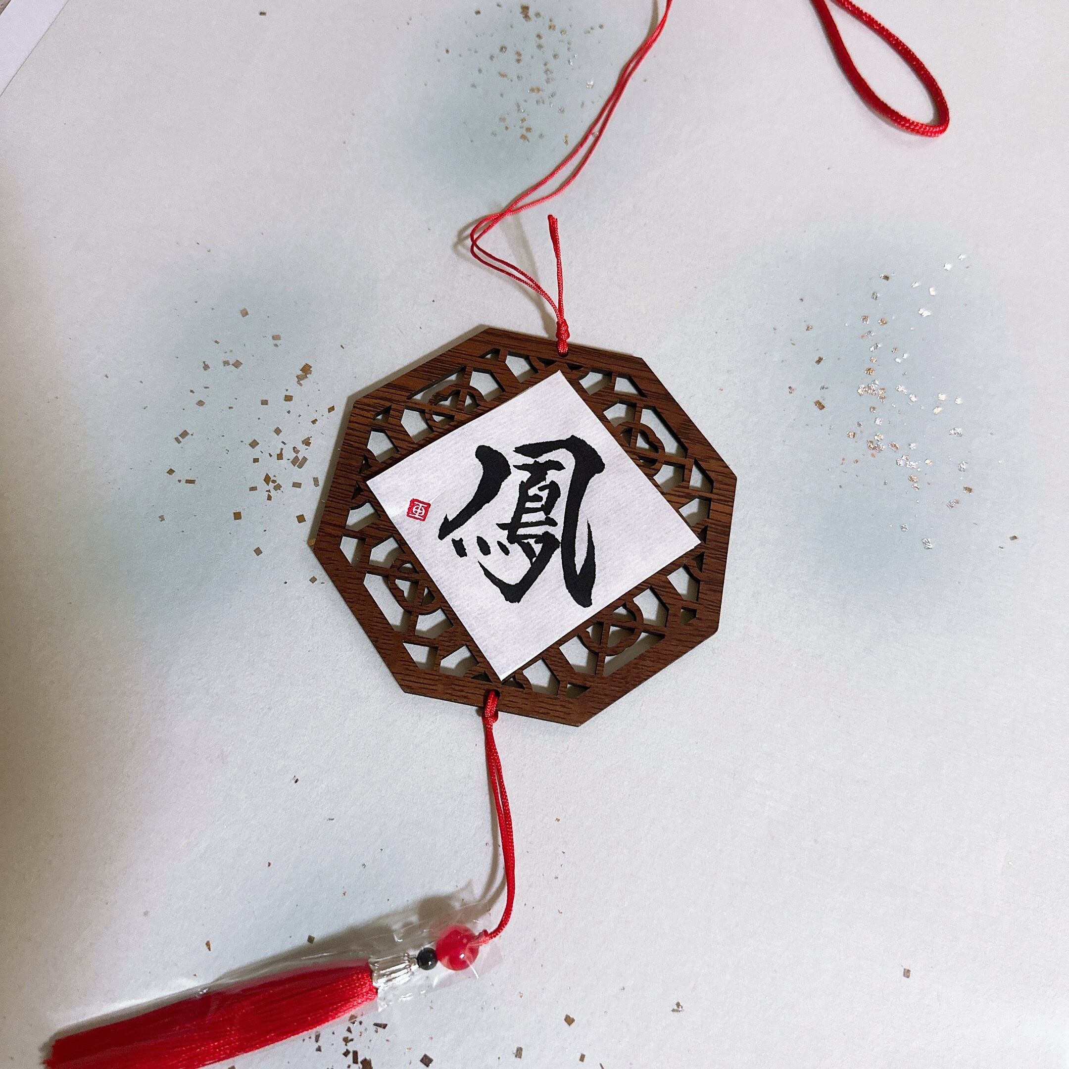 風水で良いとされる八角形の壁飾りは、あなたの空間に特別なエネルギーをもたらします。中央には、好きな文字をお入れできるため、センスあふれるオリジナルの装飾品としても楽しめます。また、飾り紐付きでお洒落さも兼ね備えています。